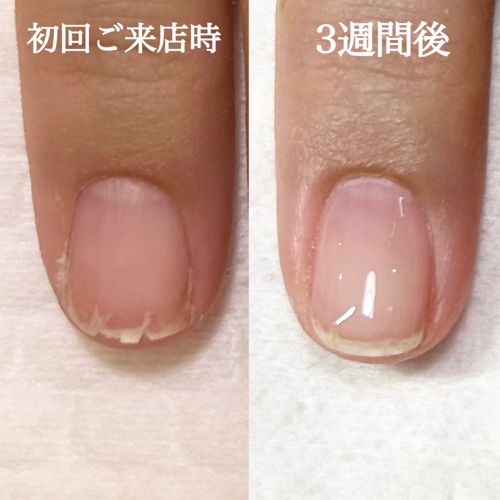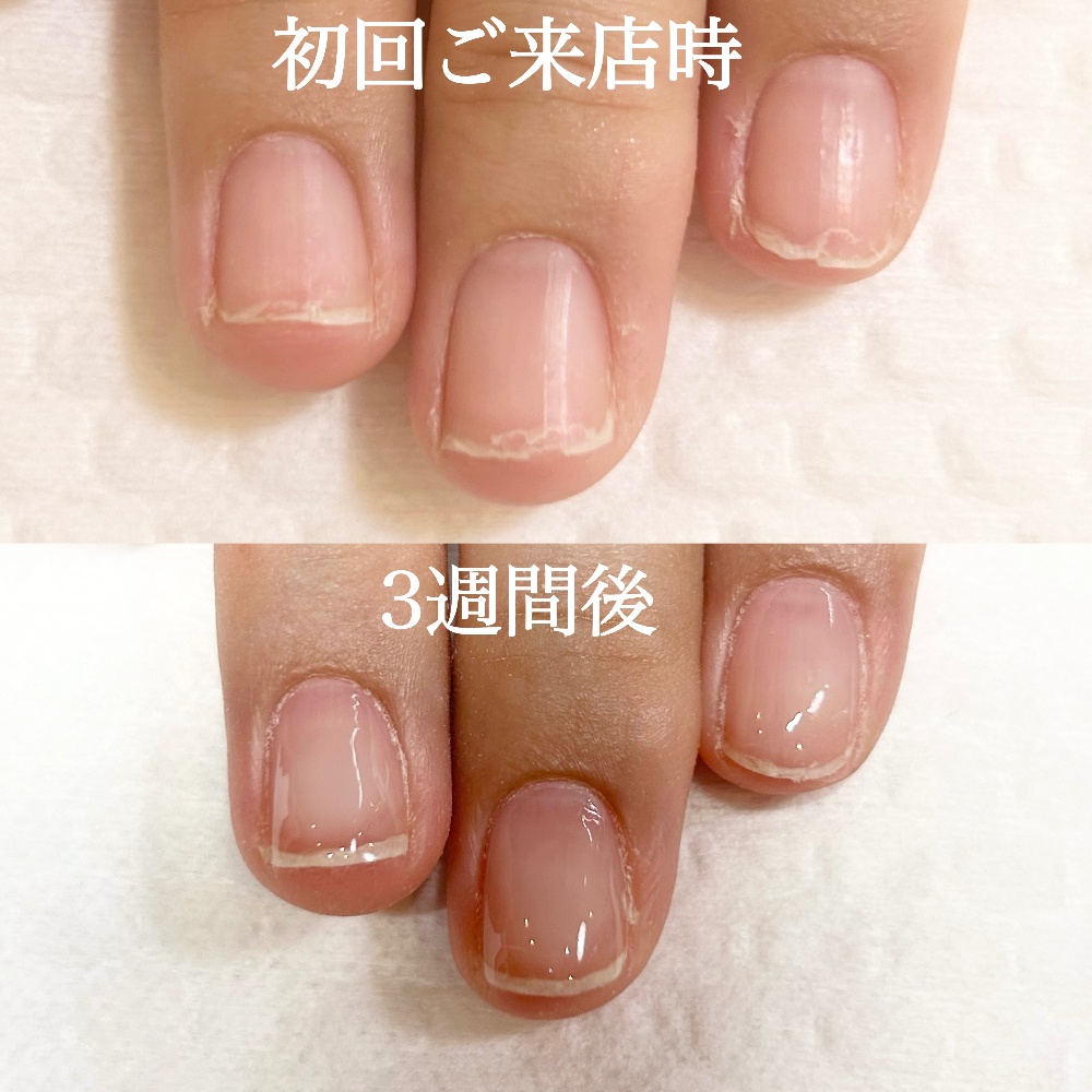ジェルネイルをつけ、3週間後にはひび割れ知らずのお爪へ☆3週間後に初回ご来店時のお爪のお写真をお見せすると、こんな爪だったんだ!!とびっくり^^以前のお爪を忘れるくらいご満足いただいております!!!お爪のお悩みはぜひ当サロンへ!!