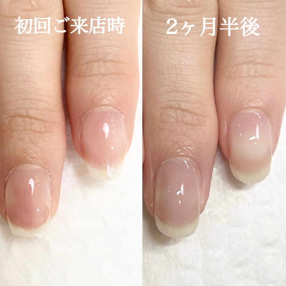 こんにちは!!滋賀県南草津の自爪育成ネイルサロン ラブーケのサヤカです^^今回は別サロンで自爪育成をされていましたがすぐにジェルが浮いてしまう…と、お悩みでご来店いただきました!もともとキレイなお爪でいらっしゃいましたが、当店へご来店くださり2ヶ月半で更にキレイな縦長のお爪へ成長されました☆