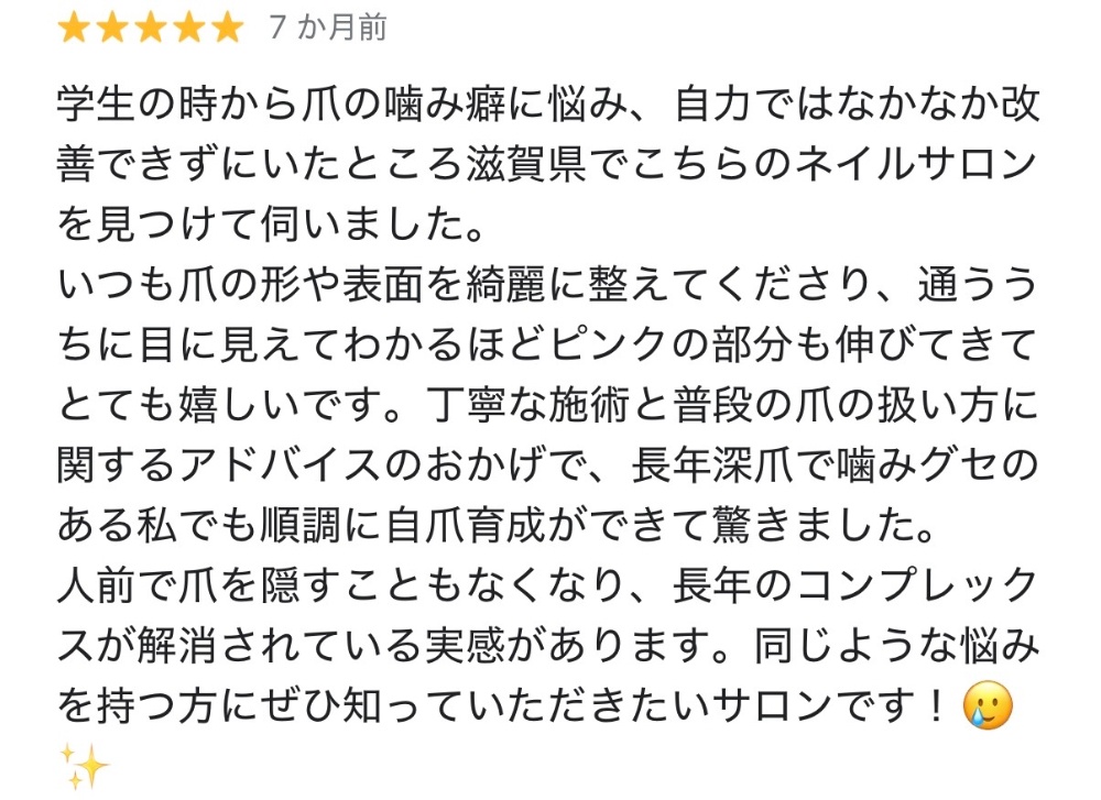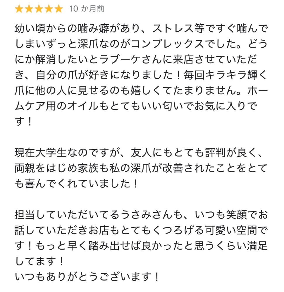 幼い頃から爪を噛む癖があり、深爪で悩んでいたお客様